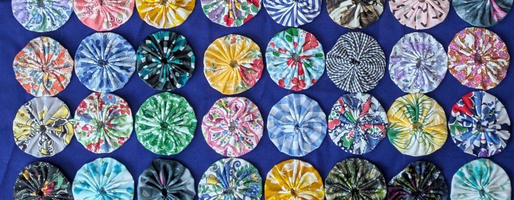 Current obsession June & July 2025…Suffolk Puffs or Yoyo’s as they are called in the US… following a workshop at SW London Quilters with member Jan Reid & show & tell of a mini Yo-yo necklace made by member Penny Bamber.