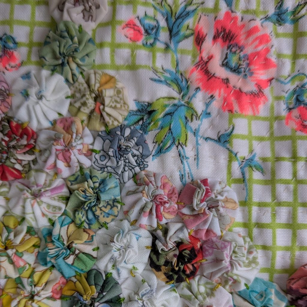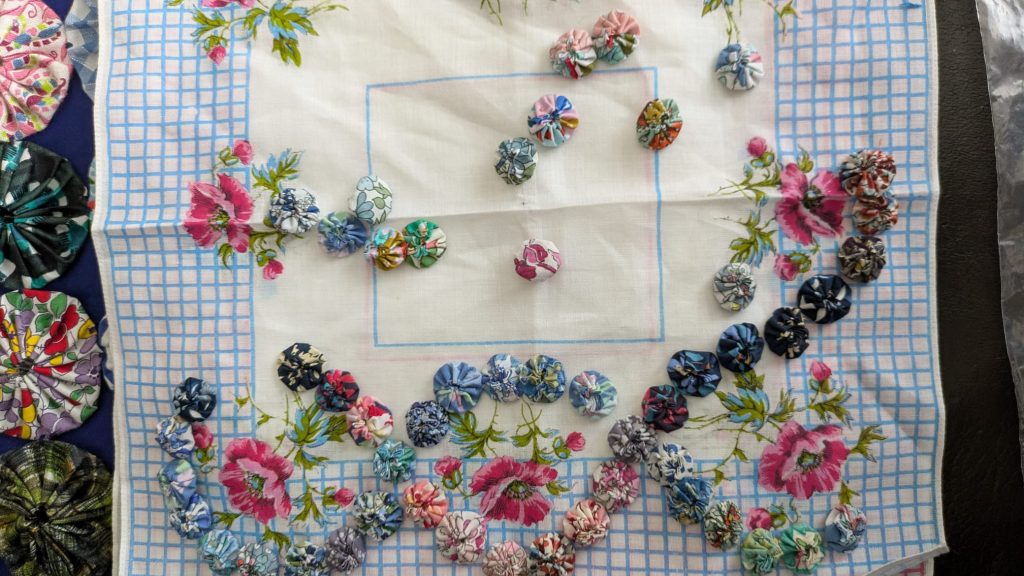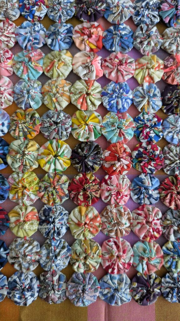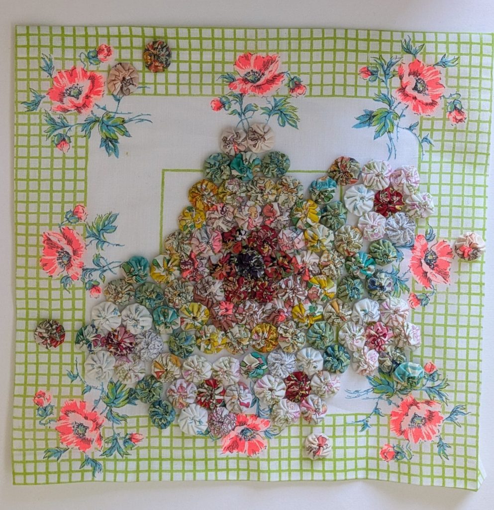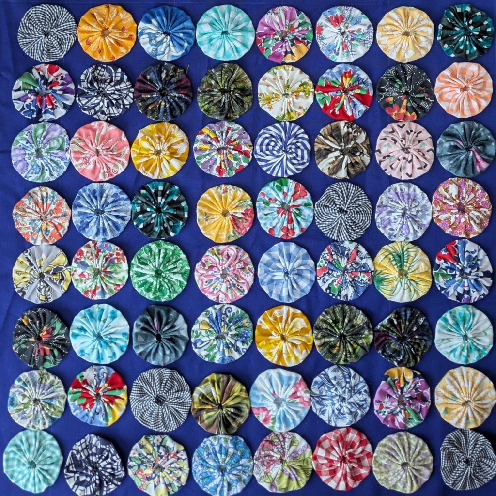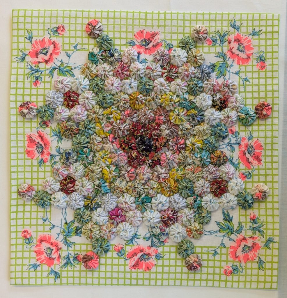 Current obsession June & July 2025…Suffolk Puffs or Yoyo’s as they are called in the US… following a workshop at SW London Quilters with member Jan Reid & show & tell of a mini Yo-yo necklace made by member Penny Bamber.